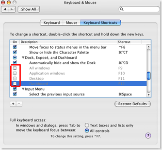 1. Прежде всего, зайдя в меню Mac OS (System Preferenсes>Keyboard&Mouse>Keyboard Shortcuts) снимаем галочки напротив клавиш F9,F10,F11,F12, за которыми в MaсOS закреплены различные операции с окнами.