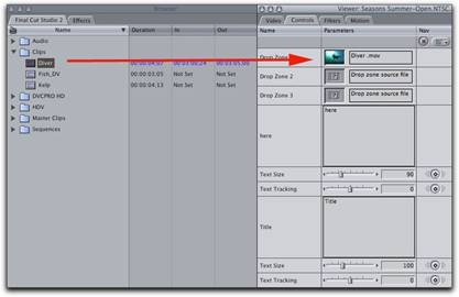 Теперь этот Motion template можно заполнить необходимыми видеоклипами и текстом - в закладке Control окна Viewer для этого есть соответствующие места (placeholders): Drop Zone - для вашего видео и Title – для текста.